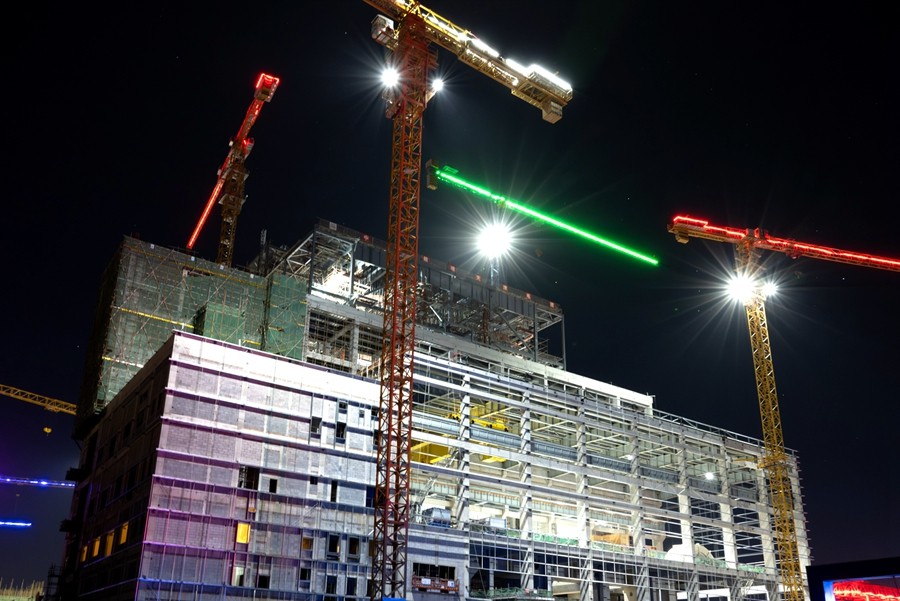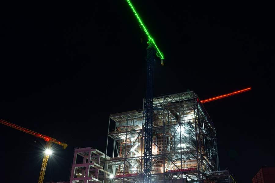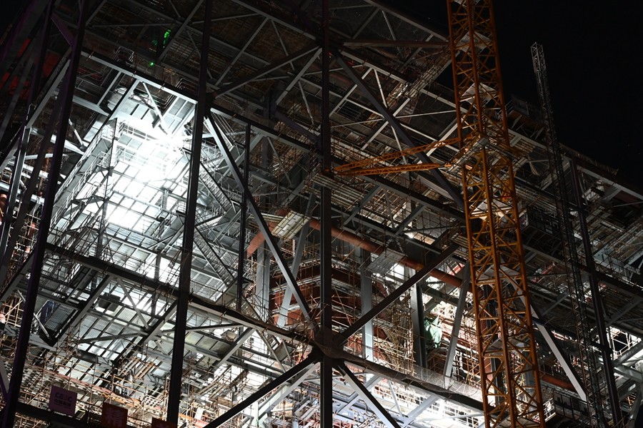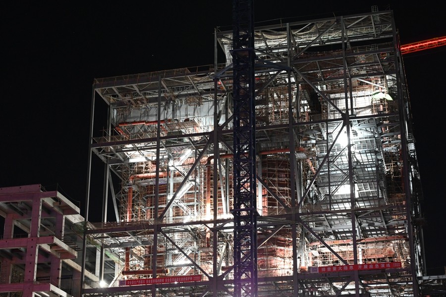 夜幕降臨,初冬的夜晚彌漫著淡淡的霜?dú)猓路鹫麄€(gè)世界都沉浸在夢(mèng)幻的氛圍中。在彬長(zhǎng)發(fā)電公司1號(hào)機(jī)組建設(shè)現(xiàn)場(chǎng),燈火通明,徹夜不熄,偉岸的鍋爐鋼骨縱橫,高聳的間冷塔直沖天際,猶如兩座巨大的燈塔在黑夜里為人們照亮前路,指引方向。(王笠臣)