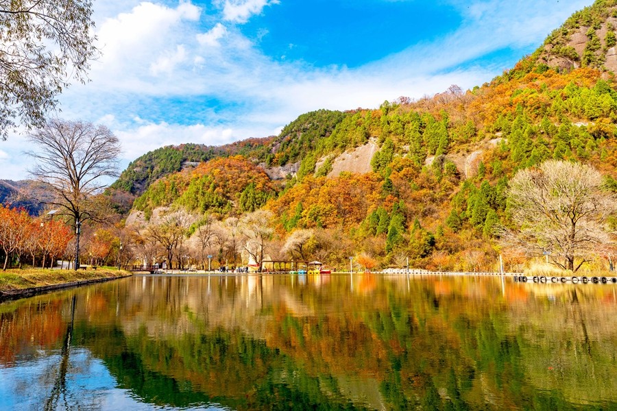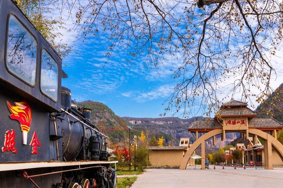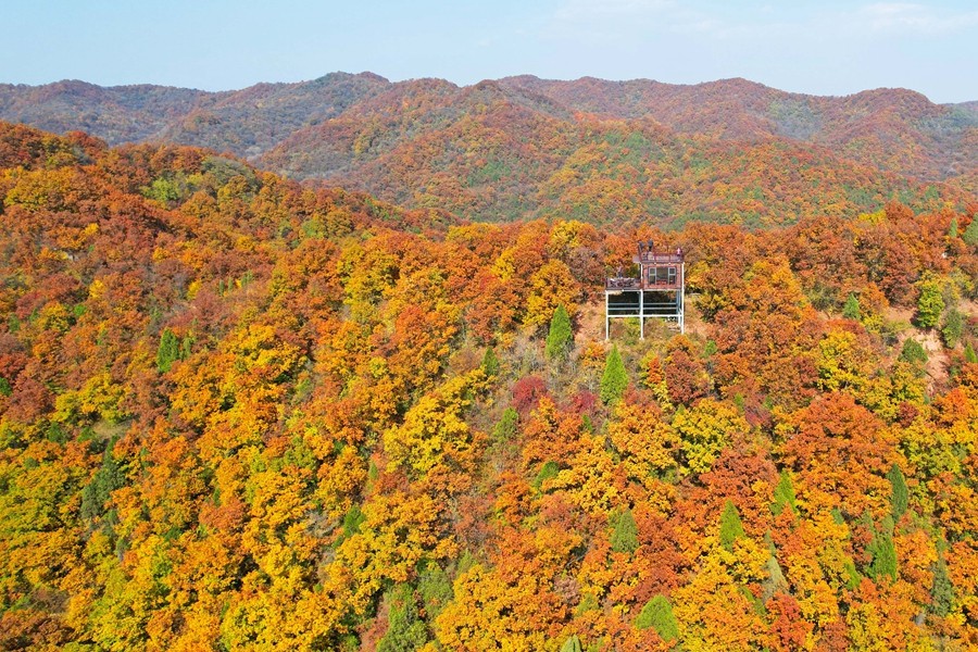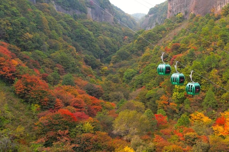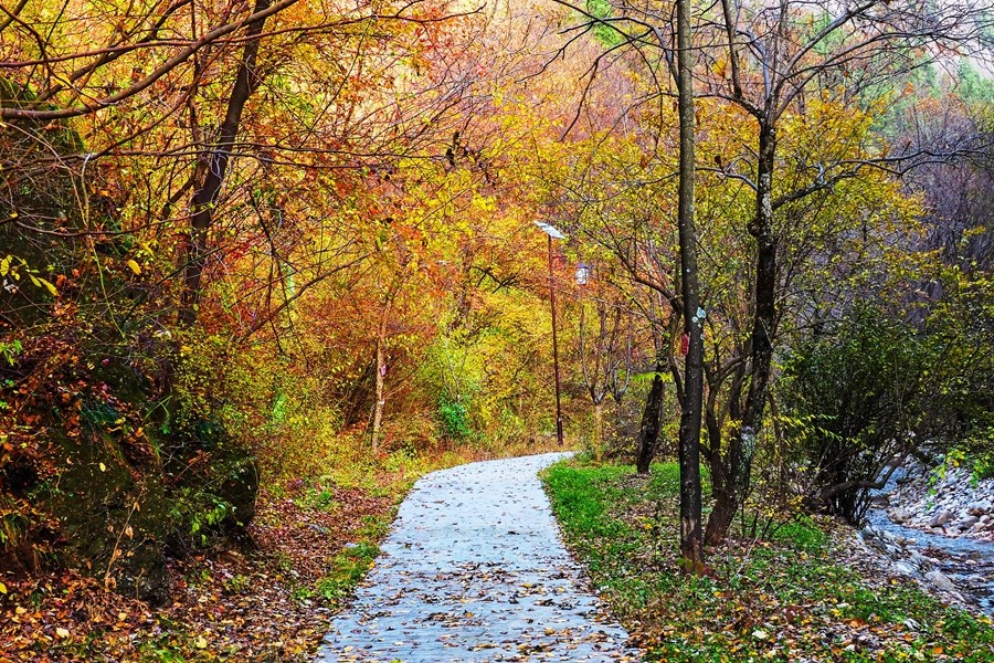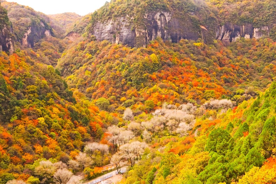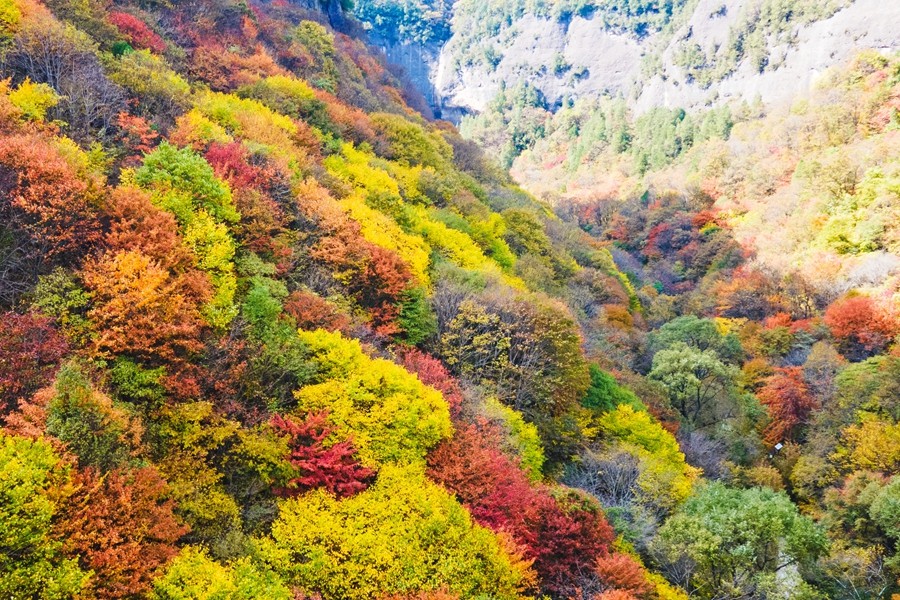 溪山勝境,位于銅川市照金鎮,是照金丹霞地貌的核心區,也是北宋范寬《溪山行旅圖》的原景地,自然景觀旖旎秀美,歷史文化富集厚重。秋季黃櫨紅葉,漫山遍野的樹木像是被打翻的調色盤,紅的似火、黃的如金、橙的像霞,五彩斑斕,美不勝收。(王丹利)