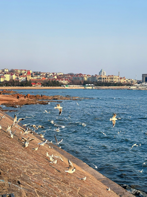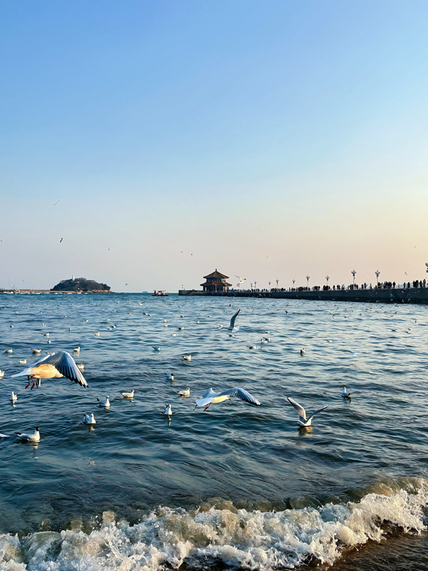 落日為信號,海風作和弦,青島的黃昏總在鏡頭里藏滿溫柔。當橘黃色的光暈浸透云層,海浪便捧起碎金搖曳;成群的海鷗,正以翅膀裁剪著靛藍的海天——倏忽掠過鏡頭,定格成靈動的標點。潮汐呼吸間,山、海、城共譜一曲克萊因藍與落日橘的交響詩。(胡家河礦 魏銥遙)